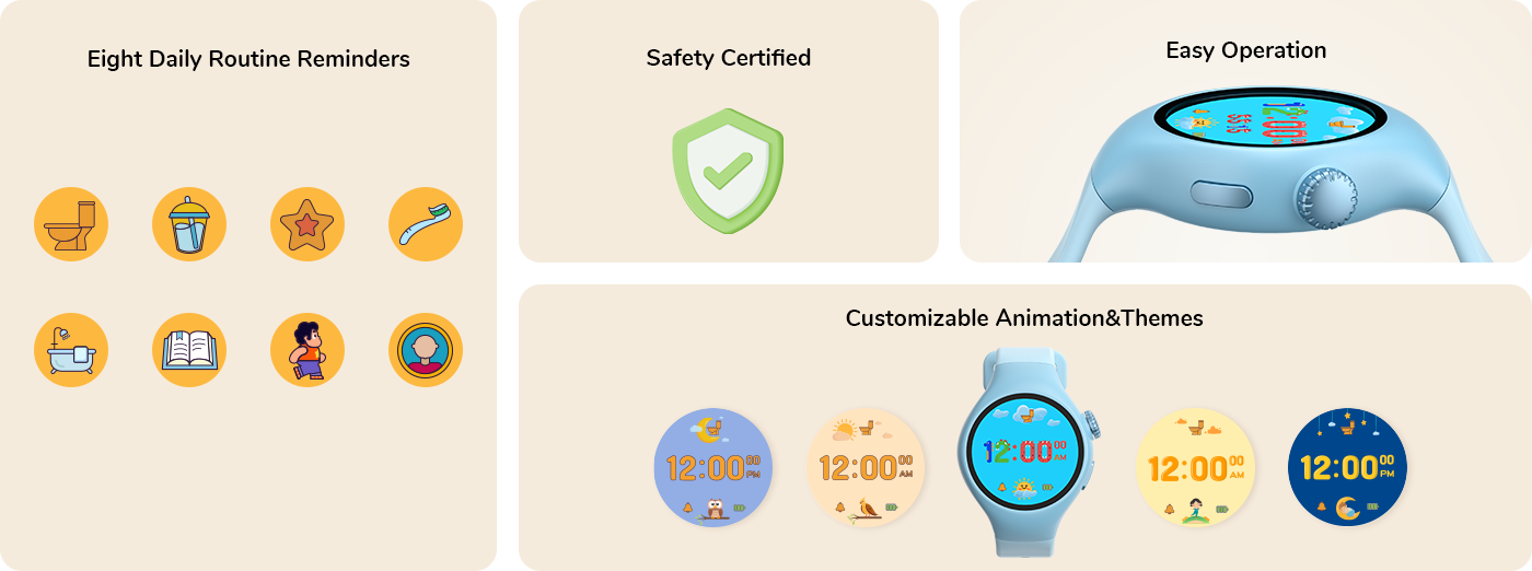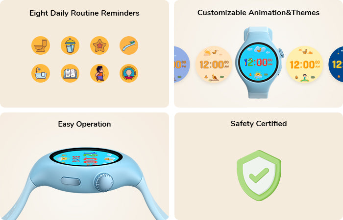 Our watch helps make potty training and maintaining good habits fun for children, featuring alarms for potty times, hydration reminders, and cues for family routines. Animated characters encourage kids to mimic healthy behaviors, turning routine tasks into enjoyable activities. With customizable alerts for various settings, it supports independence, fosters responsibility, and promotes a lifetime of healthy habits.